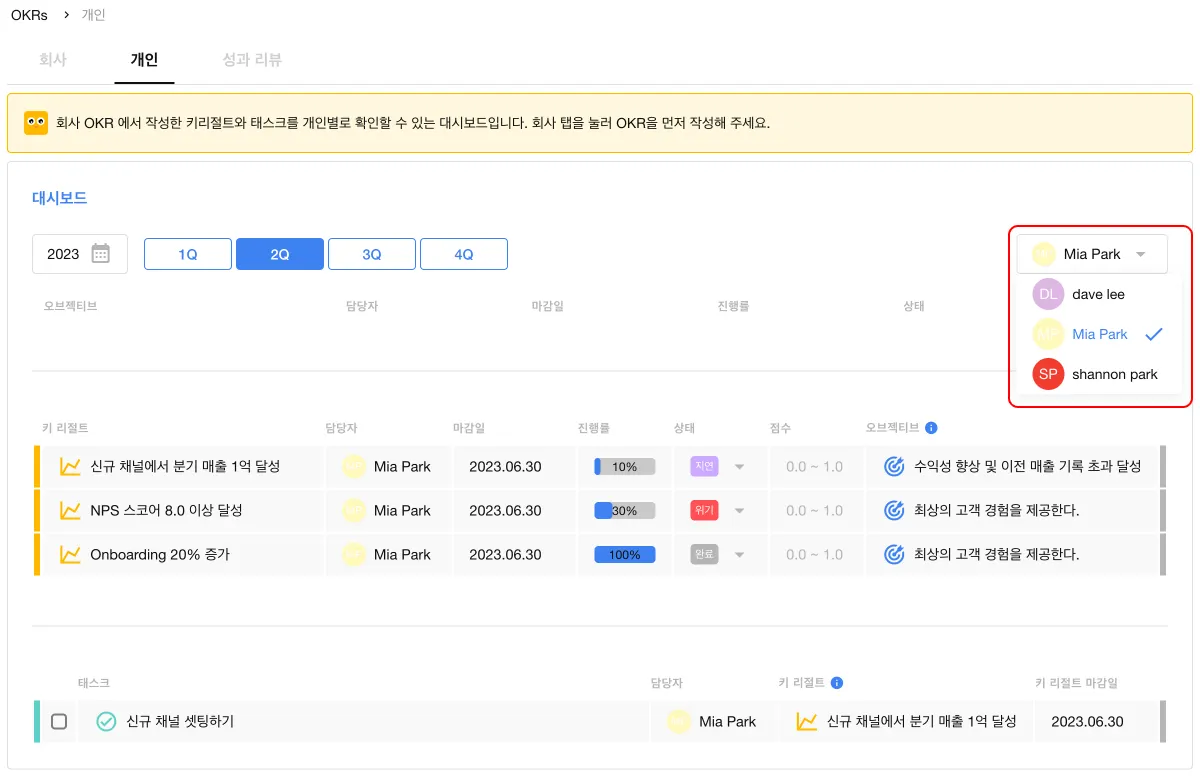 멤버별로 할당된 오브젝티브 & 키리절트를 확인할 수 있고, 태스크를 관리할 수 있습니다.