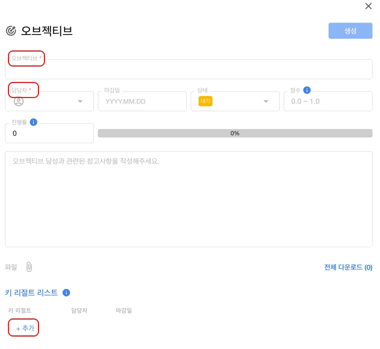 오브젝티브 내용과 담당자를 필수로 입력한 뒤, 하단에 파일첨부 버튼을 눌러 필요한 자료를 업로드 하실 수 있습니다.