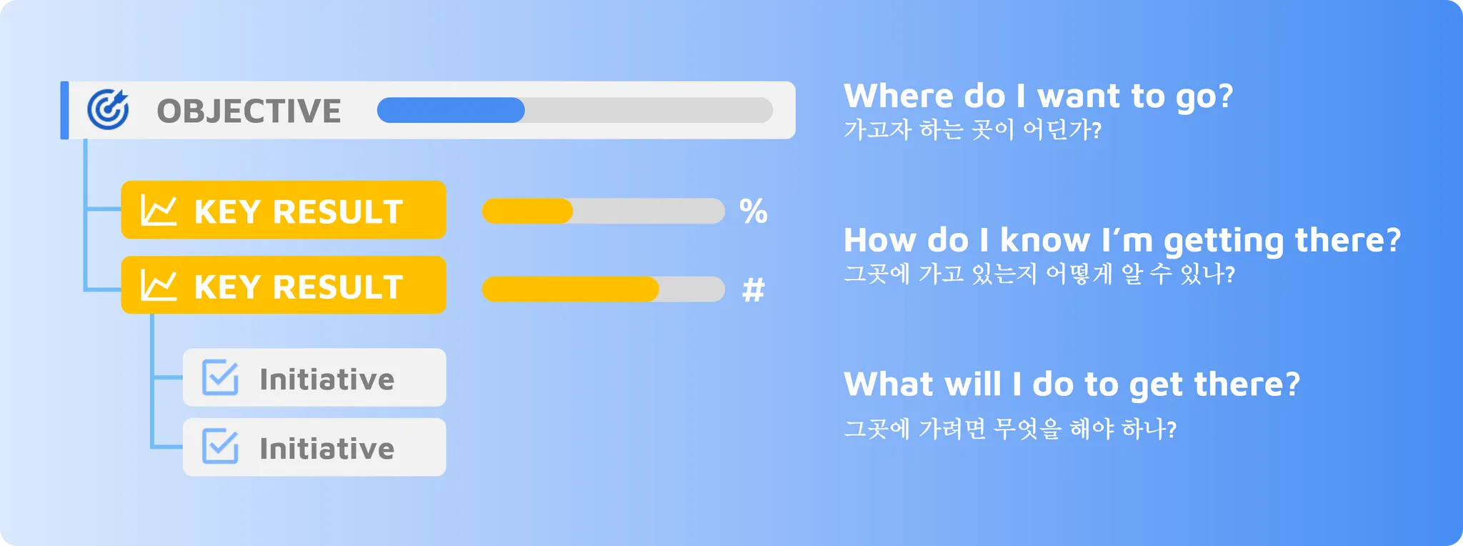 반면에 KEY RESULT (핵심결과)는 구체적이고, 측정 가능하며, 시간 제한이 있고, 검증 가능해야 합니다. 전 구글의 부사장이자 야후의 CEO 였던 마리사 메이어 (Marissa Mayer)는 “숫자가 없으면 핵심 결과가 아니다” 라고 말한 것처럼 핵심결과는 목표에 대한 진행 상황을 측정할 수 있어야 합니다.