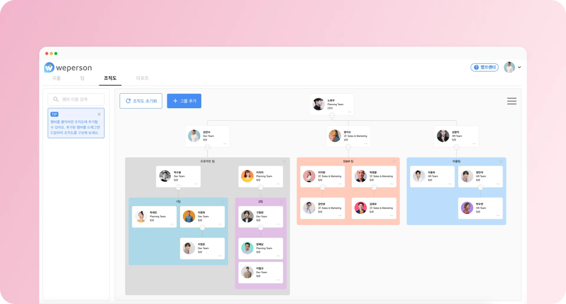 그동안 겸직 등 복잡한 조직도 생성에 어려움이 있으셨나요? 이제 조직도에서 겸직이나 그룹 설정이 가능해 져 좀 더 복잡하고 다이나믹한 조직의 구조를 조직도에 표현할 수 있도록 개선되었습니다.