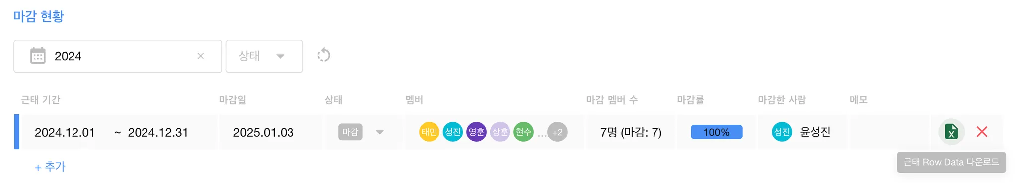 또한, 근태 마감 후 다운로드를 통해 근무설정에 따른 상세 근태내역을 엑셀로 다운로드 받으실 수 있어요.
