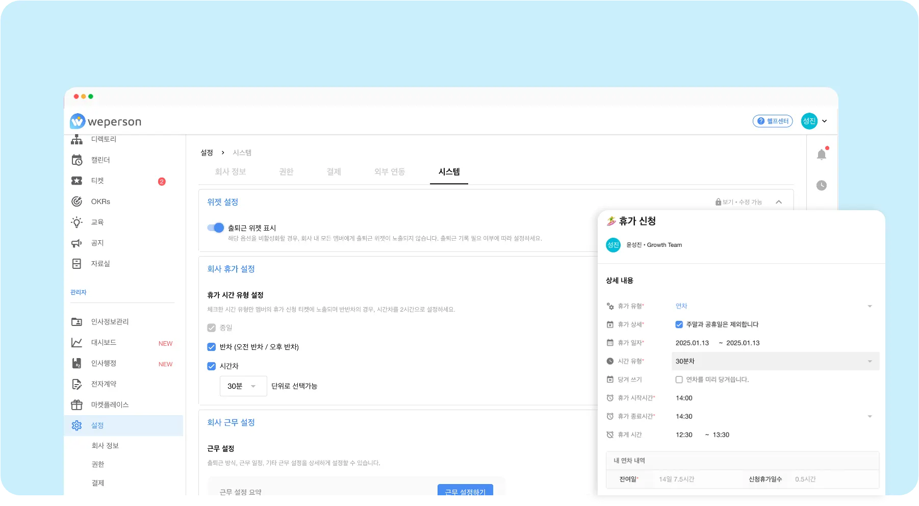 출퇴근/휴가 00시 넘어서 설정 가능 (야간 허용, 24시간단위 설정가능) [관리자메뉴 > 설정 > 시스템 ]