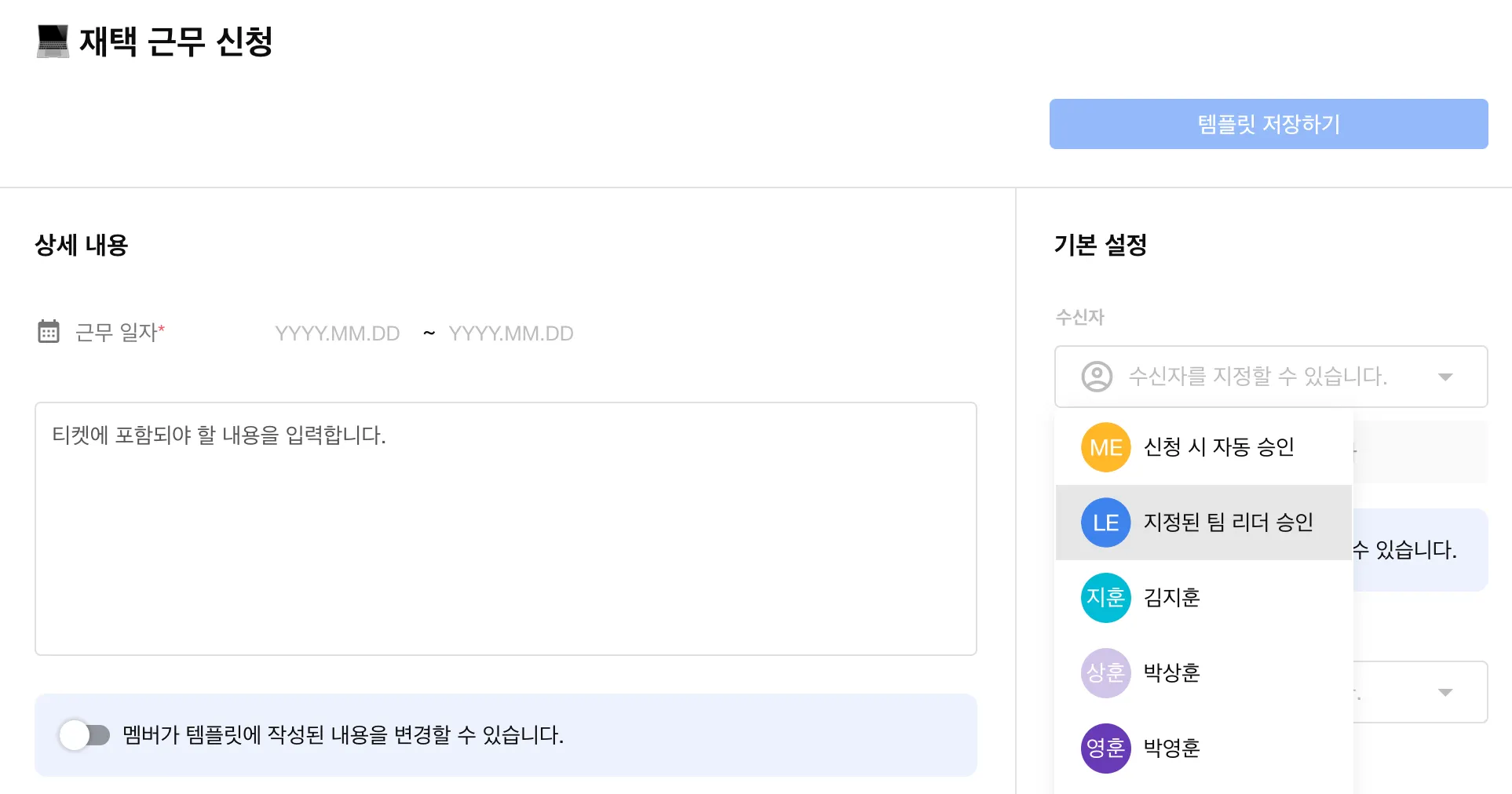 또한, 위의 팀 설정에서 조직 리더를 선택한 경우, 티켓 수신자를 지정된 팀 리더로 설정할 수 있어요.
