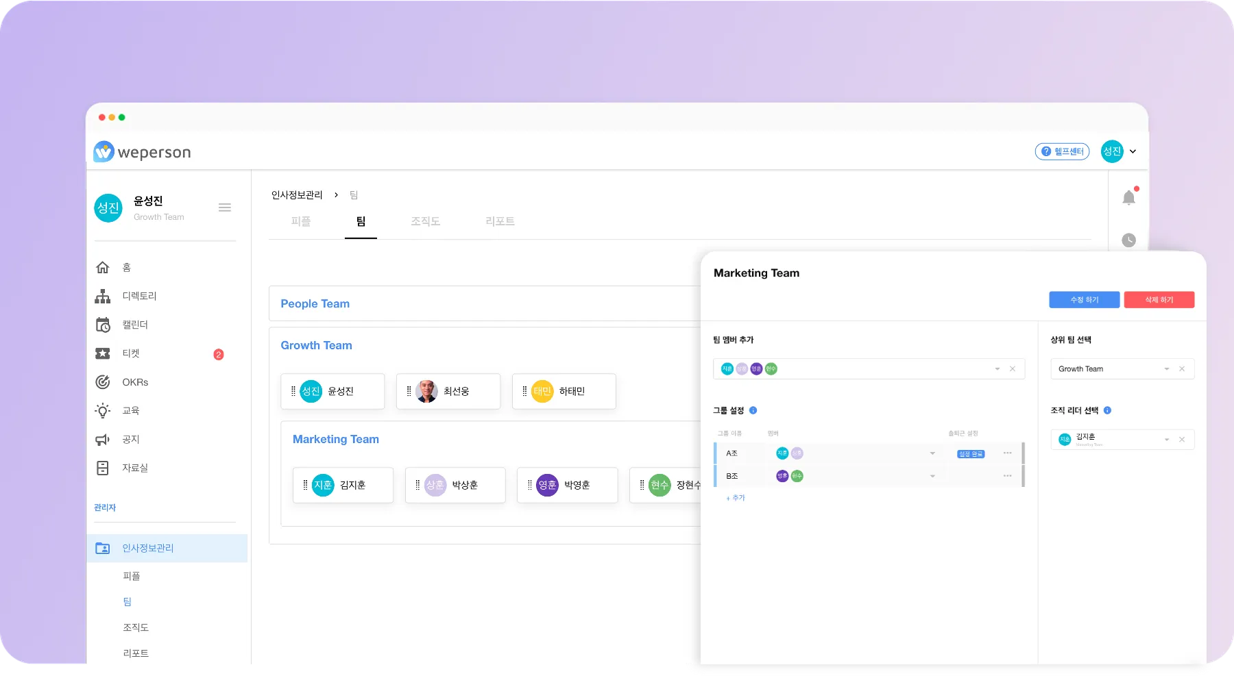[관리자 메뉴 > 인사정보관리 > 팀]