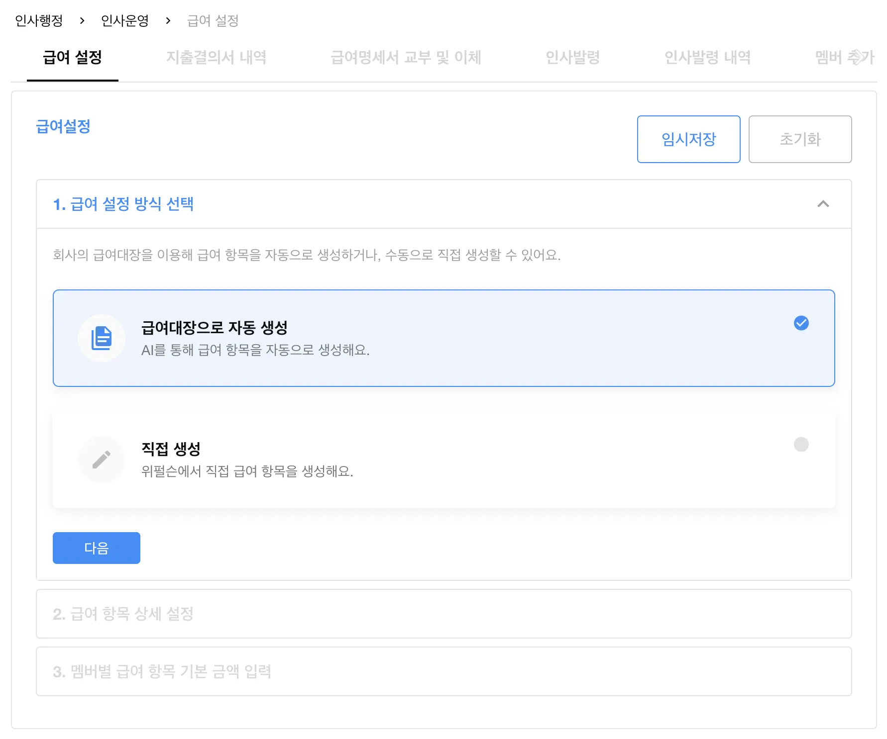 급여 설정 방식에서 급여대장으로 자동 생성을 선택한 뒤,