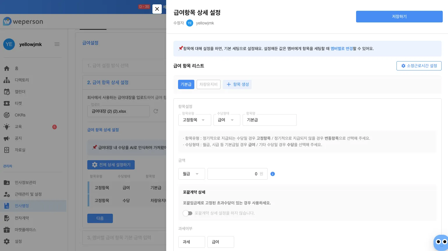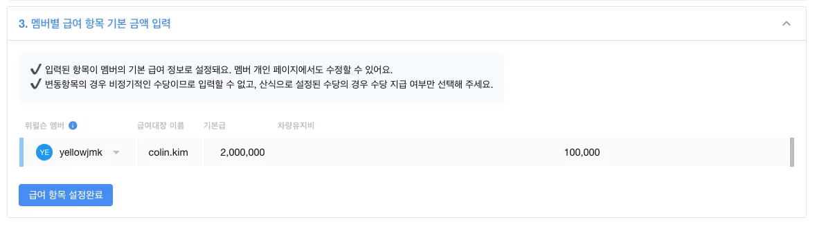 금액이 기입되거나 수당 여부가 선택된 경우, 멤버에게 해당 항목이 자동으로 생성되어 급여 페이지에 입력됩니다.