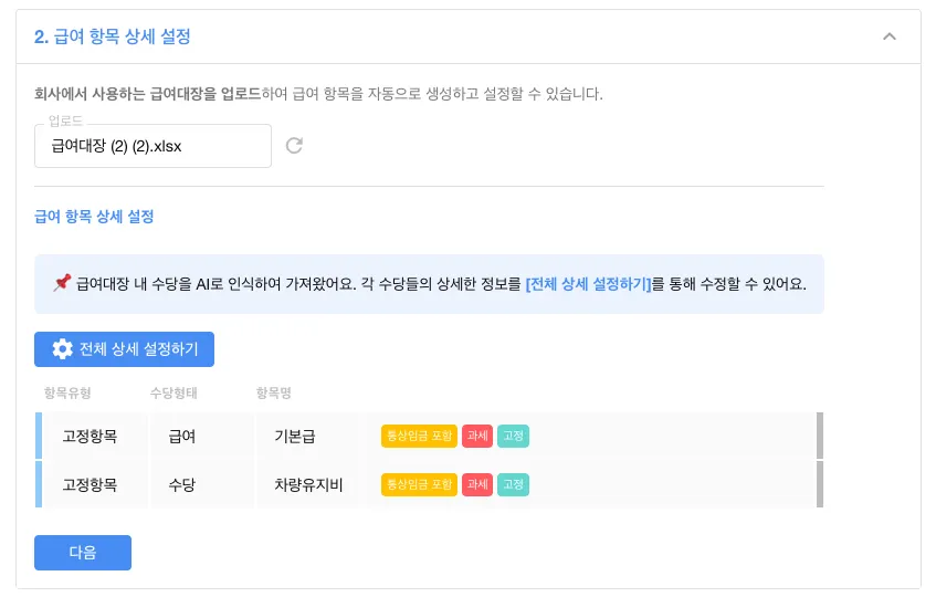 급여대장에서 읽어온 항목들이 입력되어 있습니다. 누락된 항목이나 세부설정을 등록하기 위해 전체 상세 설정하기를 클릭해 주세요.