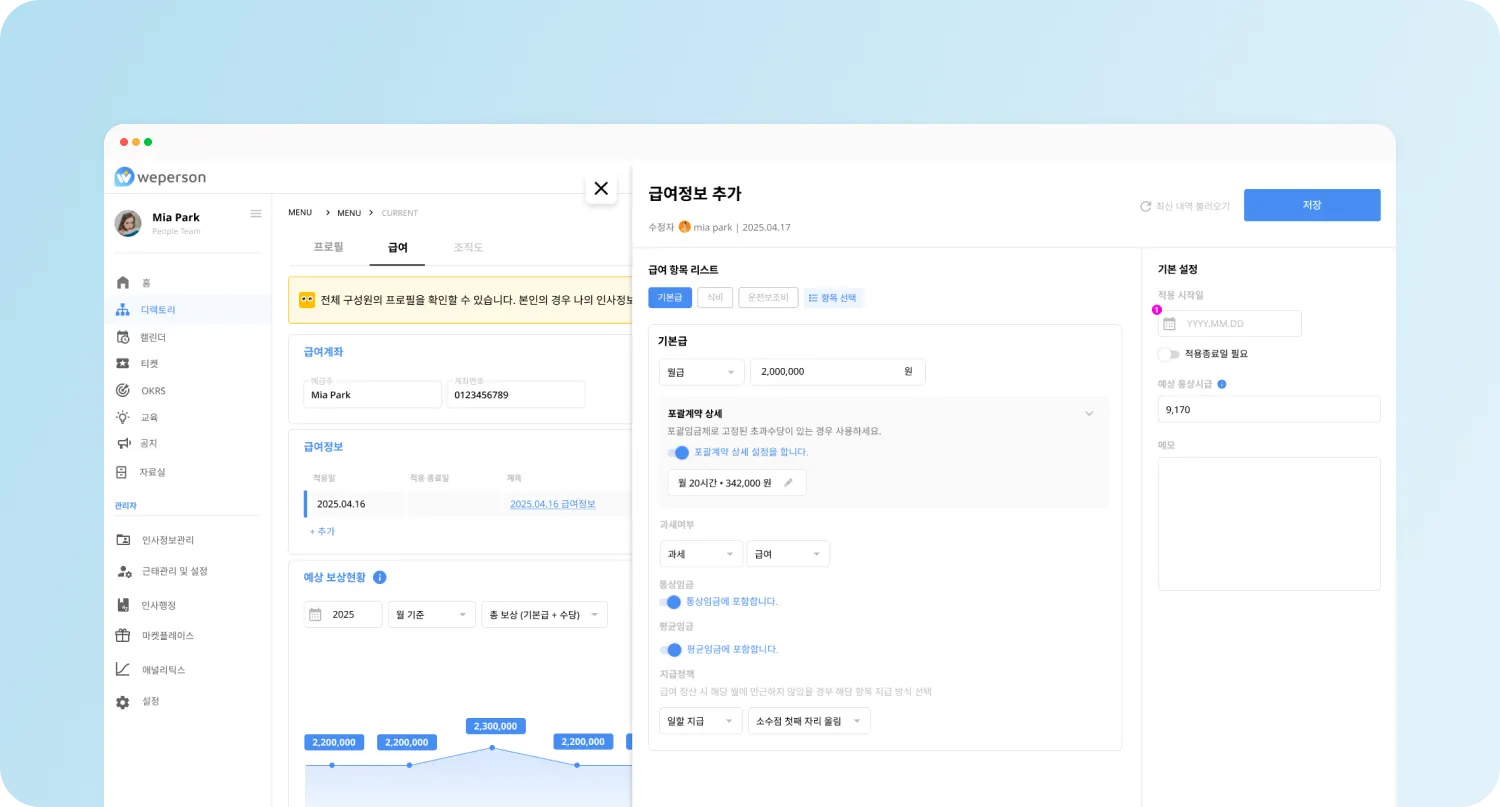 회사의 급여정보를 세팅하고 멤버의 급여정보를 더 자세하게 설정 및 관리할 수 있도록 페이지가 개선되었어요.