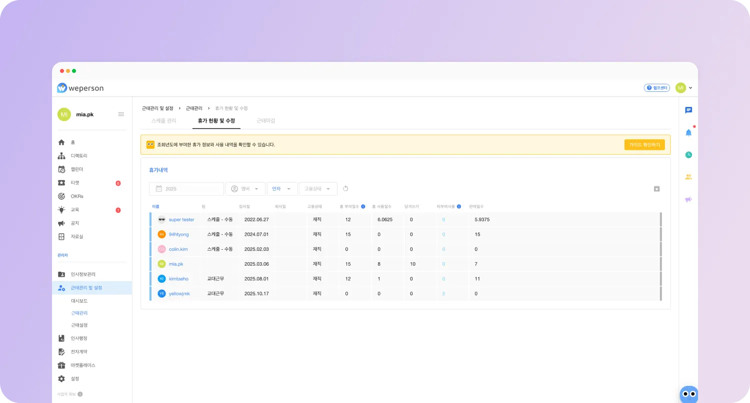 당일 및 당해년도 기준으로 휴가내역을 표기하기 때문에, 간편하게 확인할 수 있어요.