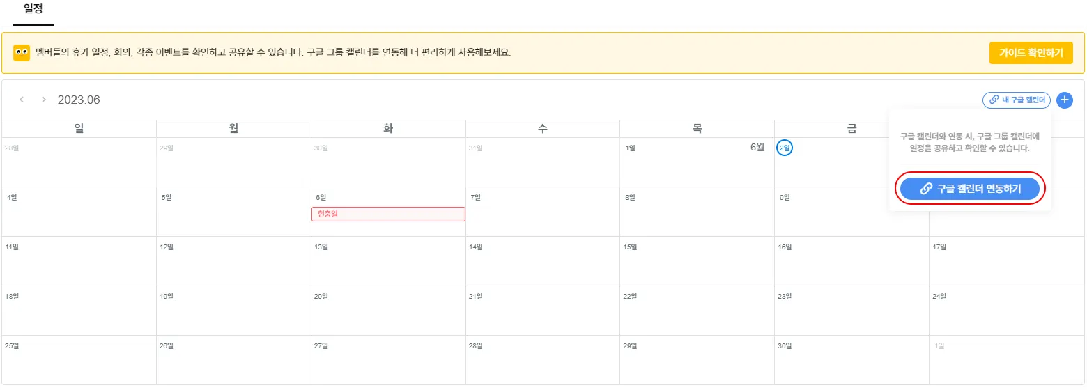 ( * 내 구글 캘린더 버튼이 보이지 않는다면 관리자가 회사 설정에서 그룹 캘린더를 먼저 연동해줘야 합니다.