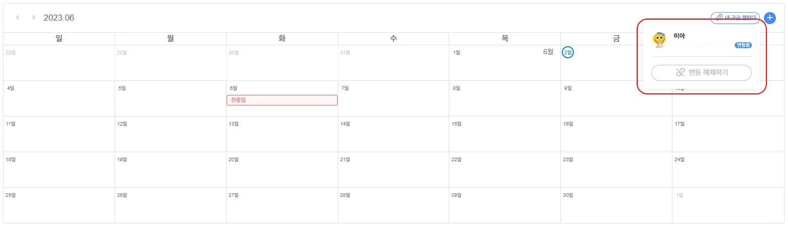 연동이 완료되었다면, 연동된 계정과 연동 상태를 내 구글 캘린더 버튼을 클릭하여 확인할 수 있습니다.