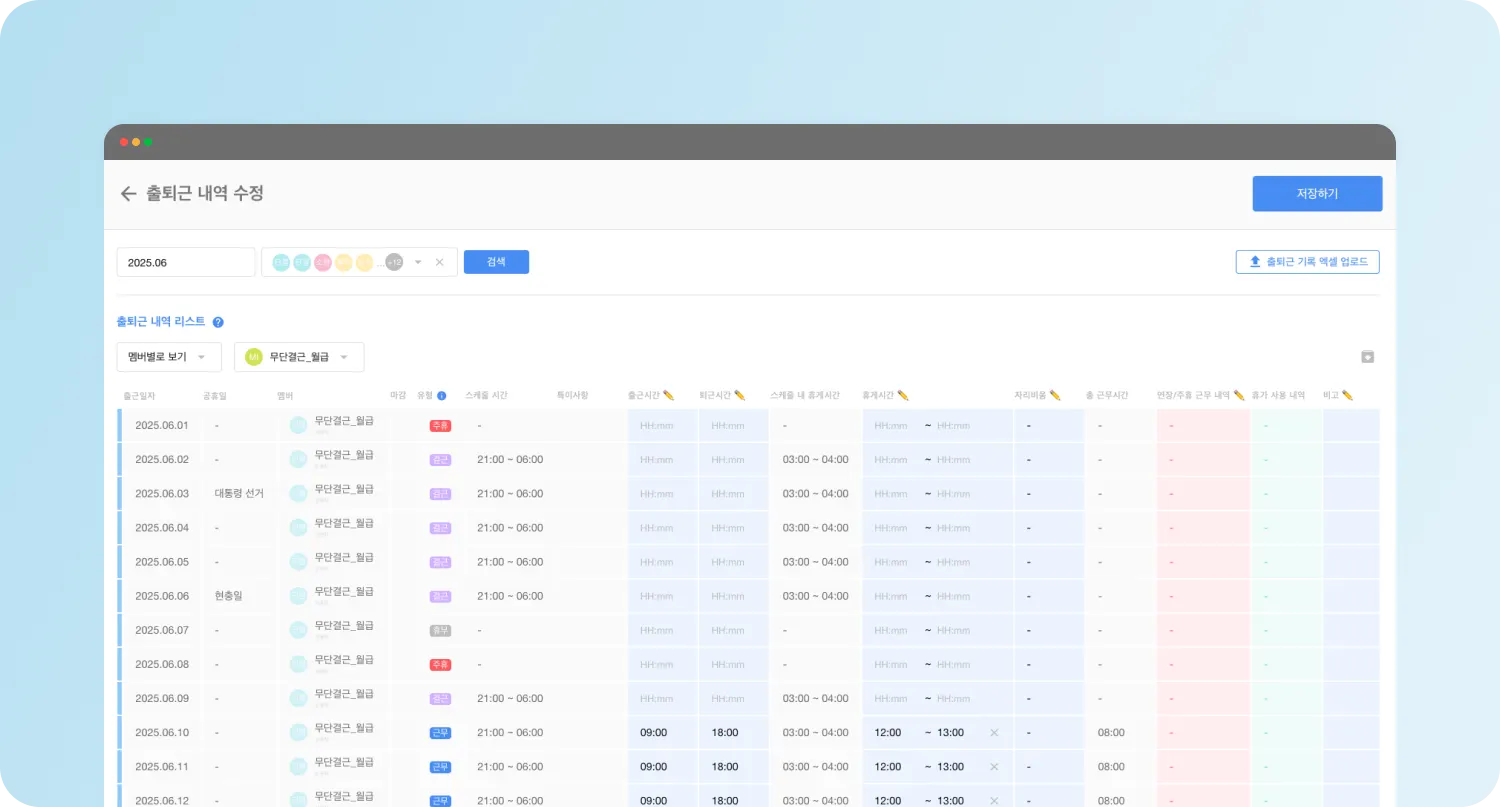 이제 조금 더 원활하게 멤버별로 확인하며 근태 내역을 수정해보세요.