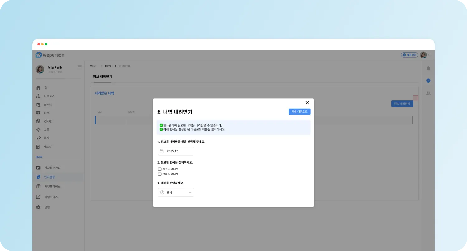 멤버들의 초과근무, 연차 사용 내역을 한 달 단위로 내려받을 수 있는 기능이 추가되었어요.