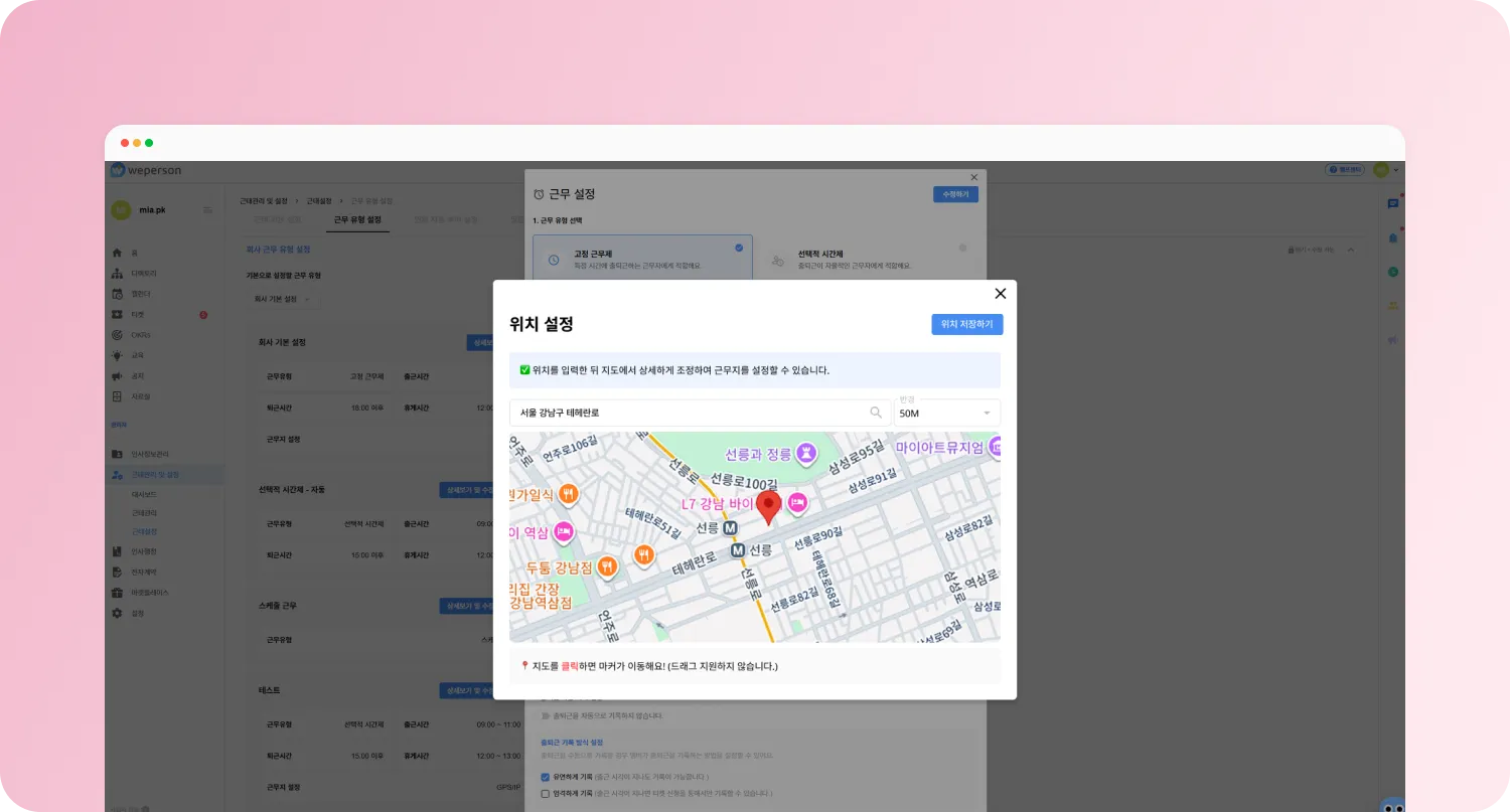 근무지를 지정할 때 지도를 보며 상세 위치나 반경을 조정할 수 있도록 개선했어요.