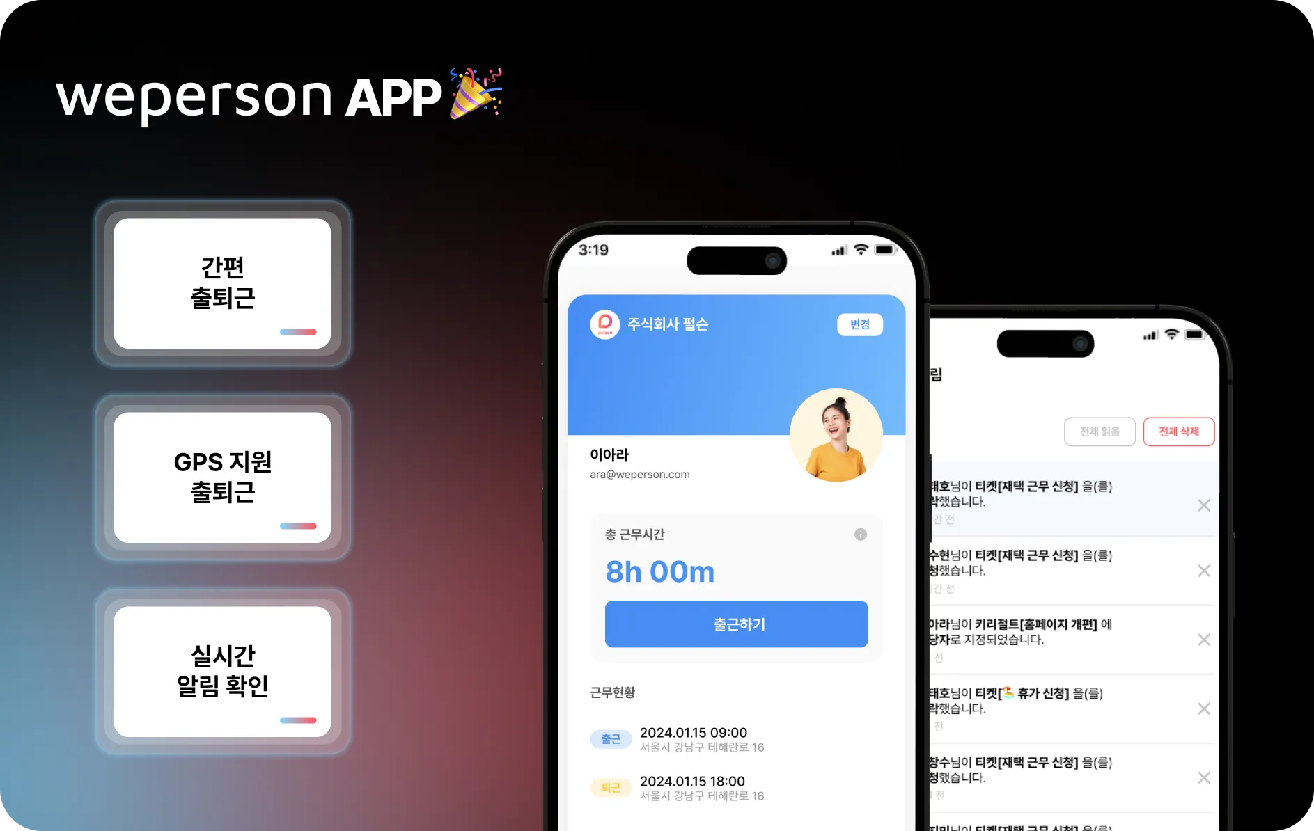 이제, 위펄슨 APP으로 출근과 퇴근을 기록하고 오늘의 근무현황을 확인할 수 있어요.