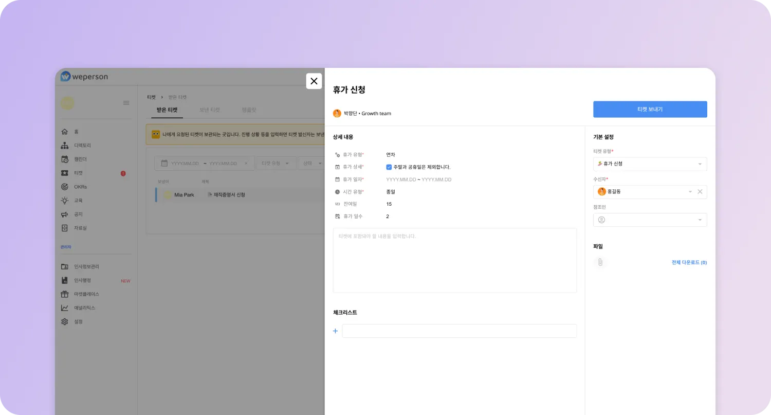 티켓이 전반적인 사용성 개선을 위해 디자인이 변경되었어요. 훨씬 더 넓은 화면으로 티켓을 확인하고, 티켓 상세 내용을 확인하며 스크롤 없이 코멘트를 작성할 수도 있습니다. 다음에는 지출결의서, 출장, 야간 근무 등 여러 티켓 템플릿 추가 뿐만 아니라 사용하지 않는 티켓을 숨길 수 있는 기능도 함께 업데이트 될 예정이에요.