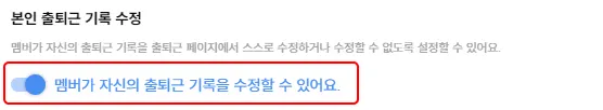 토글 ON 시 : 멤버가 출퇴근 페이지의 출퇴근 내역을 수정할 수 있습니다. 단, 생성은 불가해요.