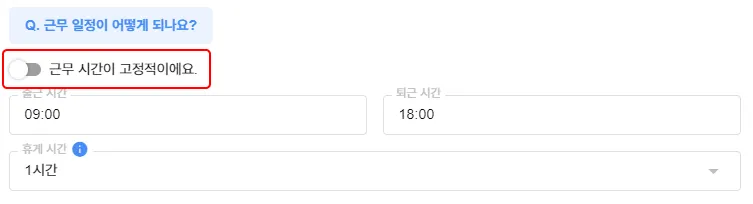 • 토글 OFF [근무 시간이 고정적이에요.] 를 선택하고 출퇴근 시간 및 휴게 시간을 선택해 주세요.