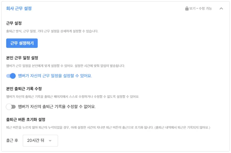 멤버가 출퇴근 페이지에서 출퇴근 내역을 스스로 수정하거나, 수정할 수 없도록 설정할 수 있어요.