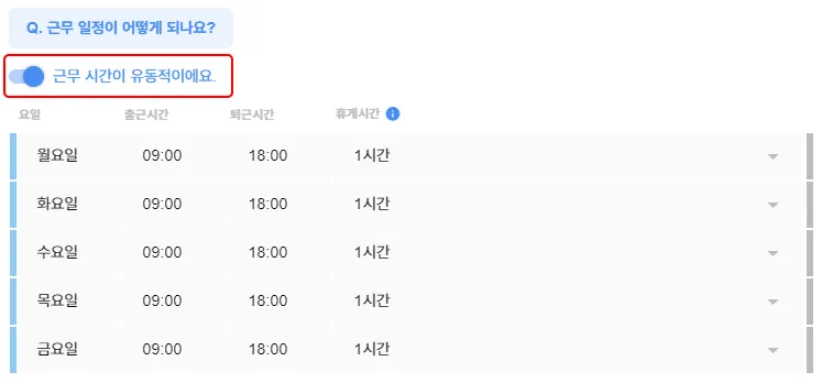 • 토글 ON [근무 시간이 유동적이에요.] 를 선택하고 각 요일에 맞게 출퇴근 시간 및 휴게 시간을 선택해 주세요.