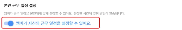멤버마다 근무 일정이 다를 경우 해당 설정을 통하여 멤버 개인이 스스로 근무 일정을 설정할 수 있어요.