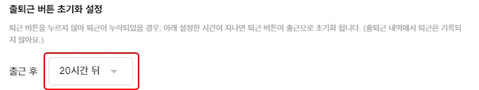 출근한 멤버가 퇴근 버튼을 누르지 않고 퇴근했을 경우, 자동으로 버튼을 초기화하는 시간을 설정할 수 있어요.