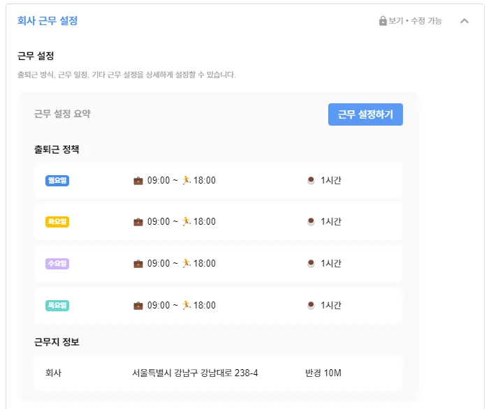 회사 공통 출퇴근 시간 및 근무와 관련하여 설정할 수 있습니다.
