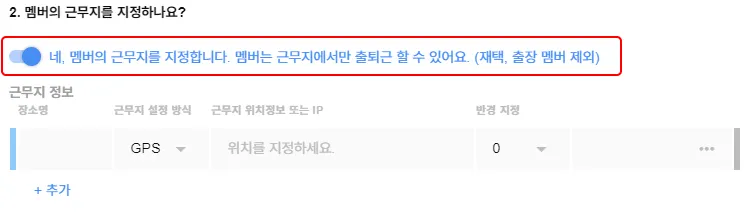 근무지 지정이 필요할 경우, GPS 또는 IP로 멤버의 근무지를 지정해주세요.