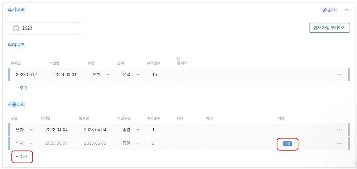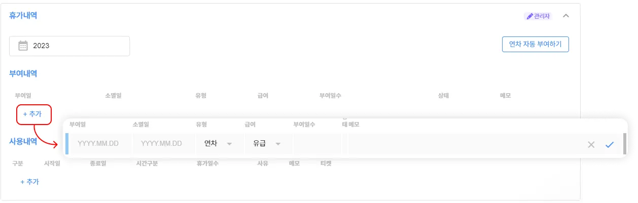 휴가부여 +추가 버튼을 클릭한 뒤, 부여할 연차의 정보를 입력해 주세요. (부여일, 부여일수)