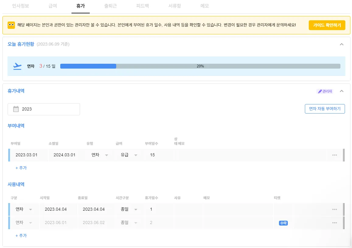 오늘 기준으로 잔여 휴가 갯수, 사용 휴가 갯수를 파악하고, 개인별로 휴가를 부여할 수 있습니다.