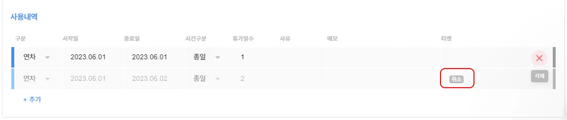 관리자가 입력한 휴가는 관리자가 사용내역에서 삭제 처리할 수 있습니다.
