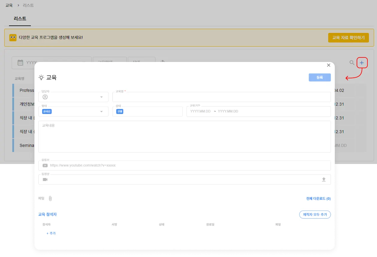 우측 상단의 + 버튼을 클릭하고 교육을 생성할 수 있습니다.