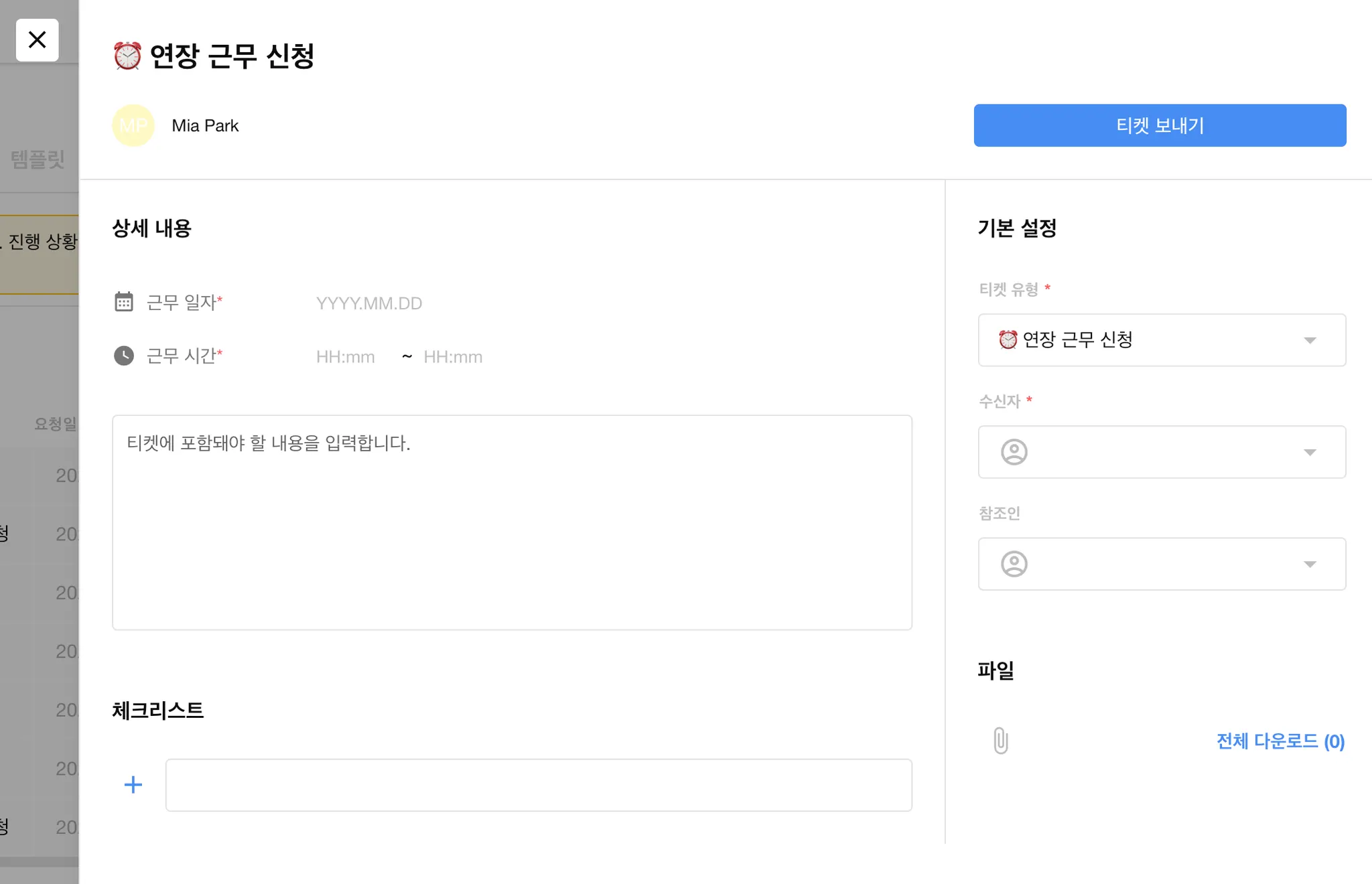 티켓 유형에서 연장 근무 신청, 주휴일 근무 신청, 야간 근무 신청 중 하나를 선택한 뒤, 수신자를 지정해 주세요.