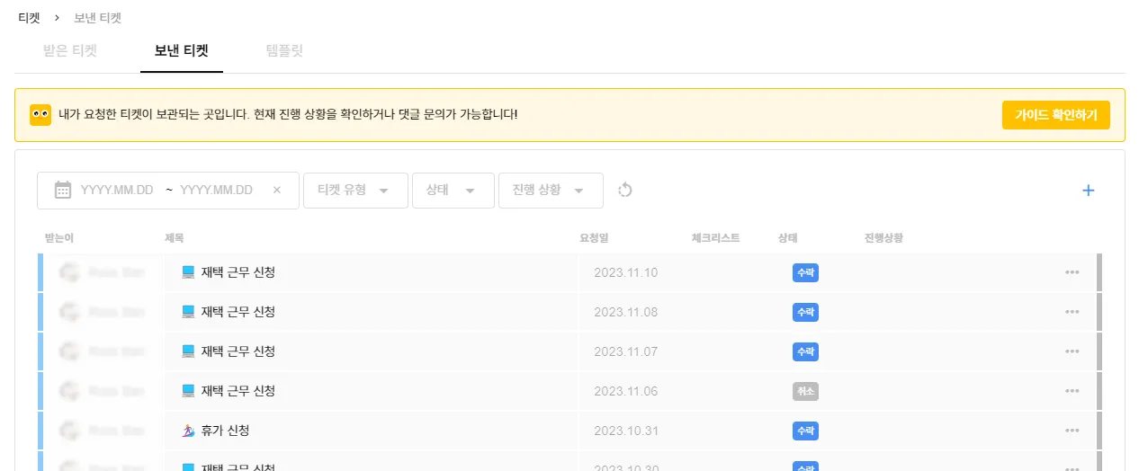 휴가신청 완료 후 티켓 > 보낸 티켓에서 발송한 티켓의 상태를 확인할 수 있어요.