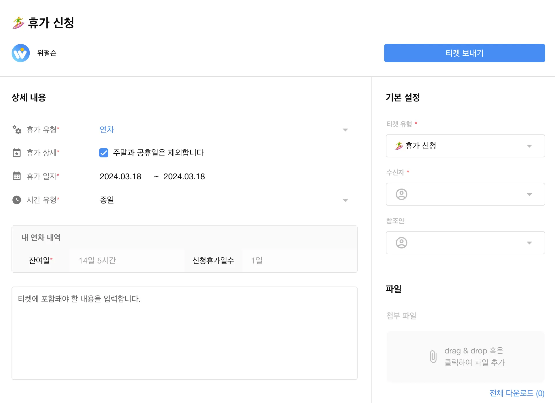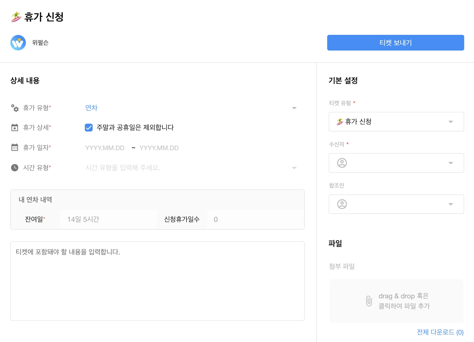 티켓을 이용해서 쉽게 휴가, 재택 근무, 비품 등을 신청할 수 있습니다.