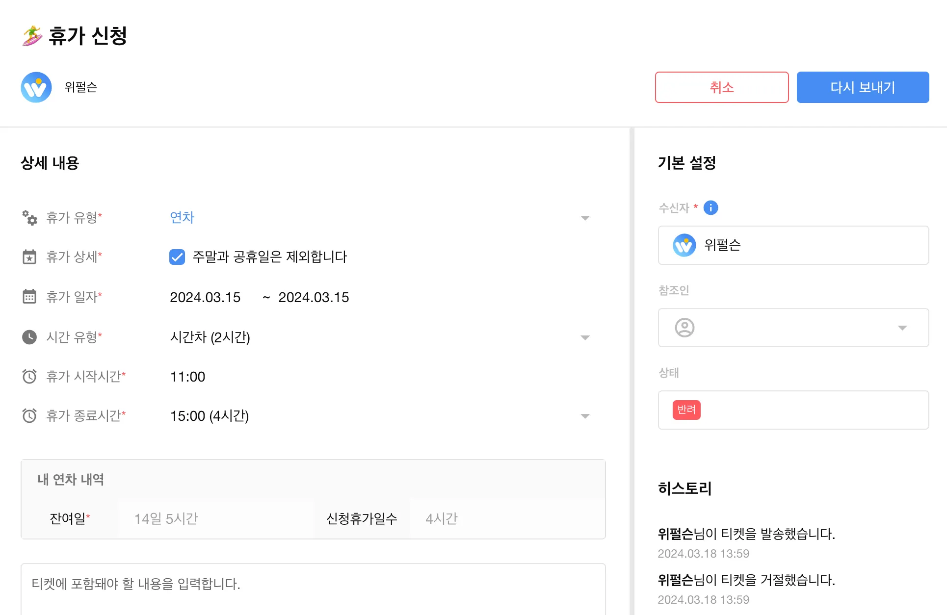 티켓이 반려된 경우 상세 내용에서 내용을 수정한 뒤 다시 보내기를 통해 티켓을 재발송할 수 있습니다.