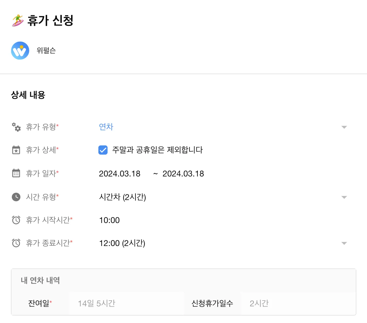 시간 유형에서 시간차를 선택하고 휴가 시작시간과 휴가 종료시간을 선택해 보세요.