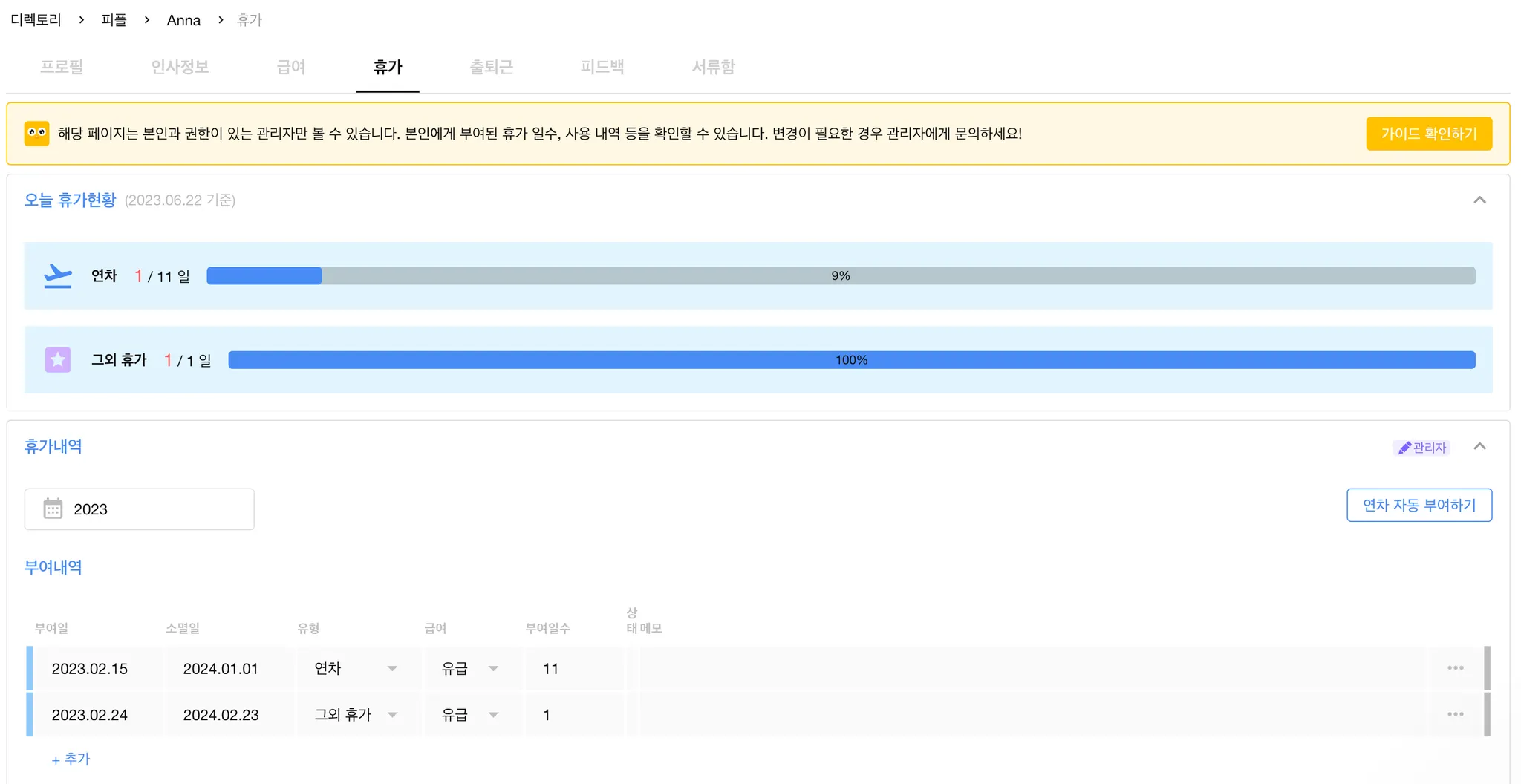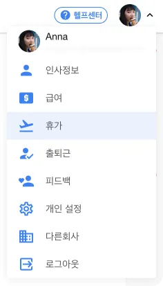 내 휴가 내역은 디렉토리 > 본인 선택 > 휴가탭 혹은 우측 본인 아바타 클릭 후 휴가를 선택해서 확인할 수 있습니다.