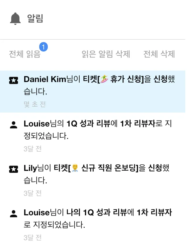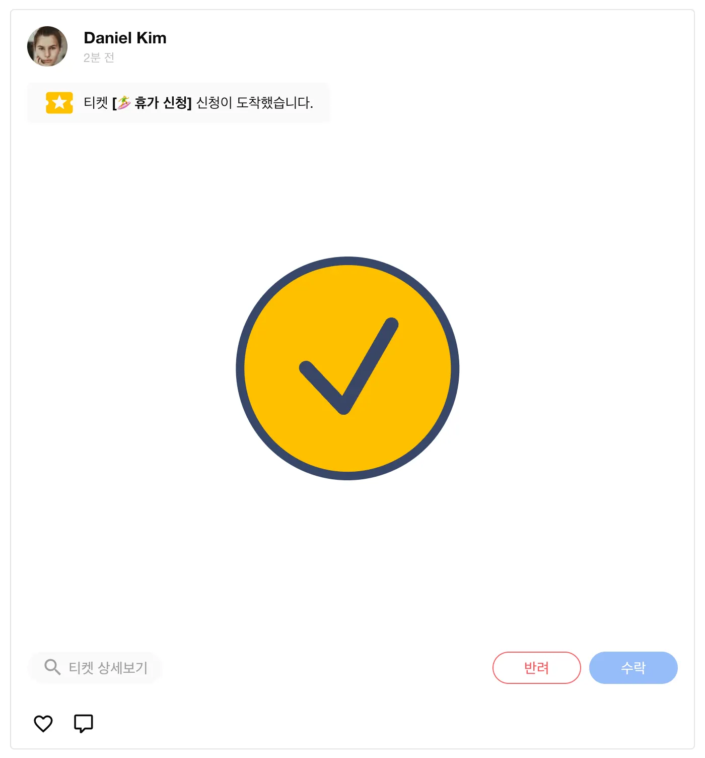 수신자는 휴가 신청 알림을 받게 되고 피드에서 바로 수락 혹은 거절을 할 수 있습니다.