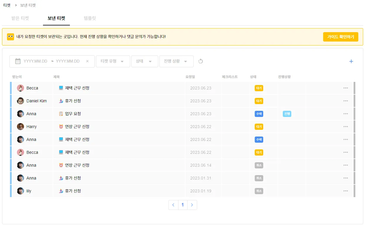 휴가신청 완료 후 티켓 > 보낸 티켓에서 발송한 티켓의 상태를 확인할 수 있어요.