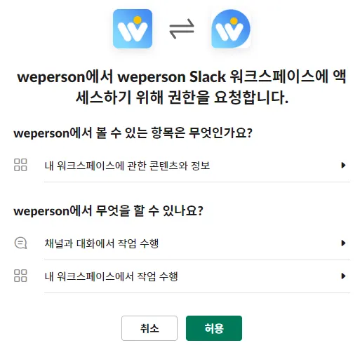 연동하기를 눌러 슬랙 워크스페이스와 연동을 허용합니다.