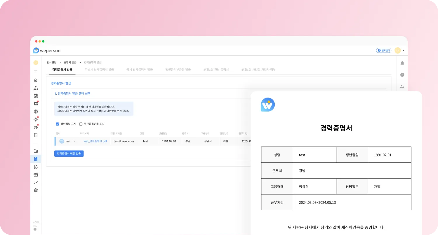 위펄슨에서 경력증명서를 생성하고, 퇴사한 멤버의 이메일로 경력증명서를 발송할 수 있어요.