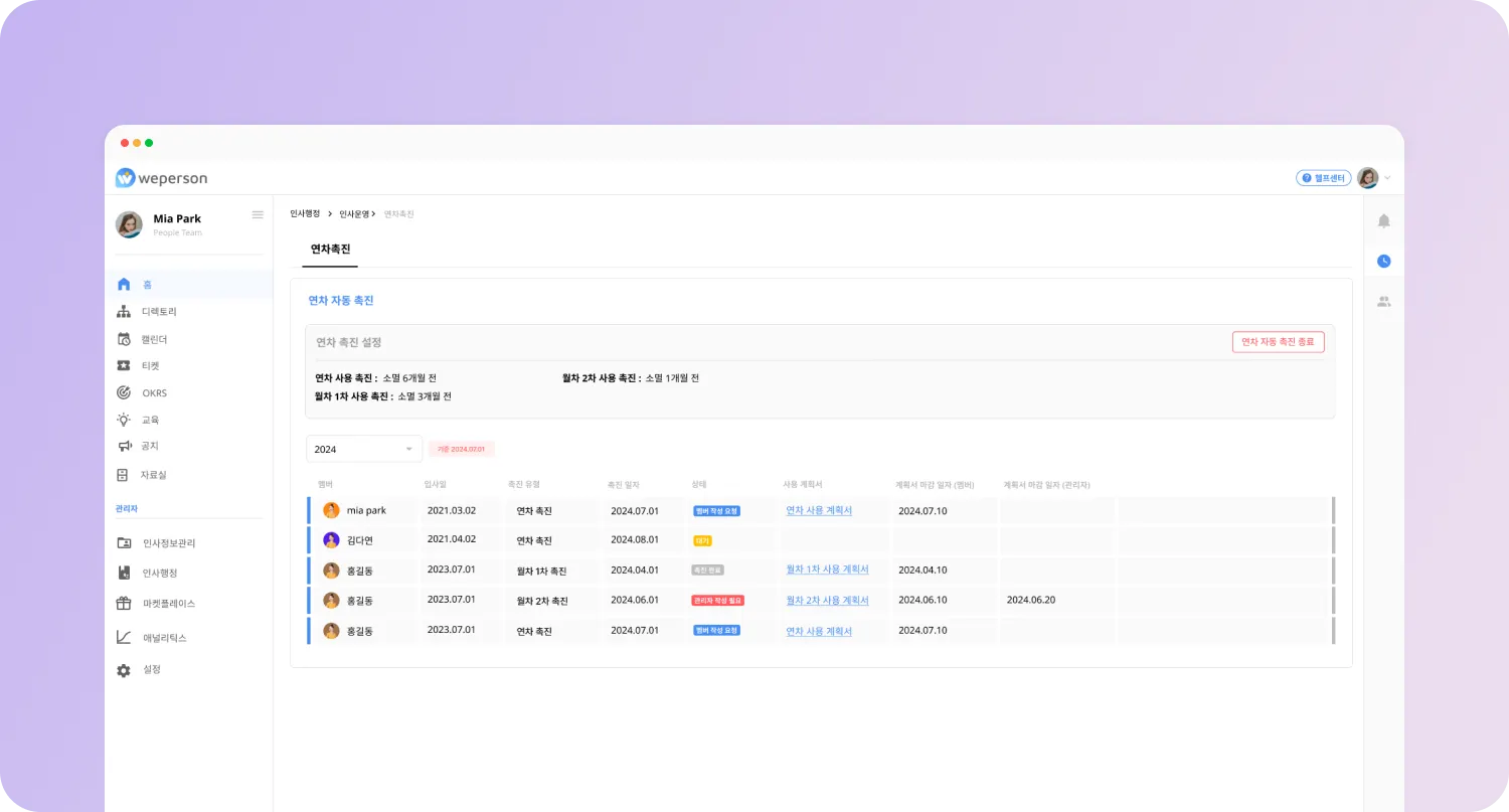 멤버들의 연차를 촉진 시기에 맞게 자동으로 촉진하고 촉진내역을 관리할 수 있어요.