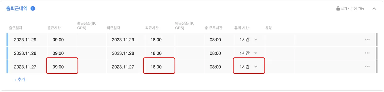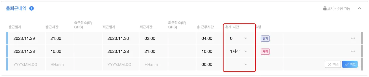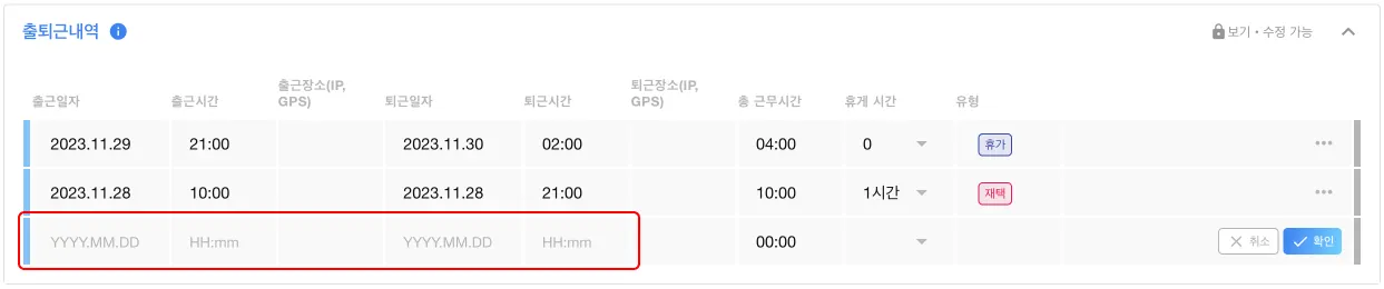 단, 시스템 > 회사 근무 설정에서 본인 출퇴근 수정이 불가하게 설정된 경우 본인 수정이 불가합니다.