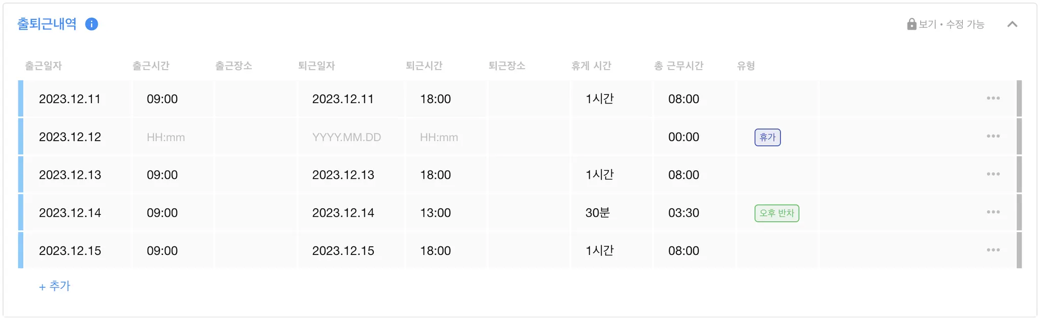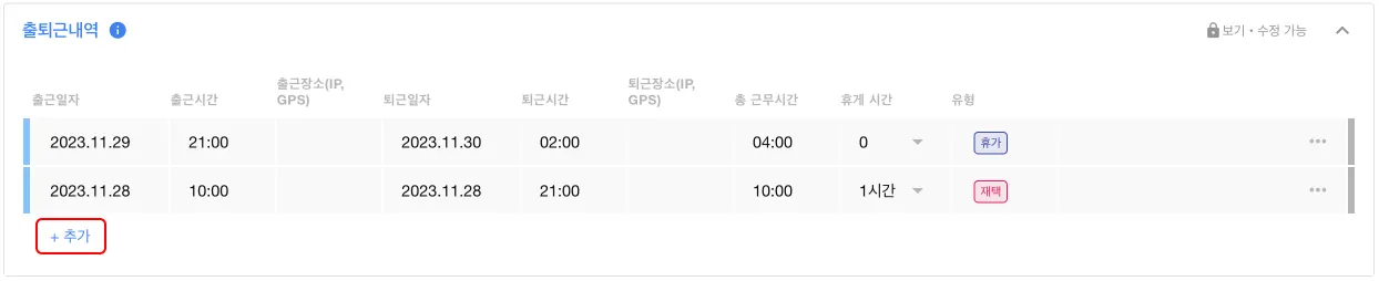 출퇴근 내역 테이블 하단의 +추가 를 눌러주세요.