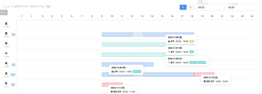 주단위 / 월단위 필터링이 가능하며 일 평균시간 / 주 평균시간 / 총 근무시간을 확인할 수 있습니다.