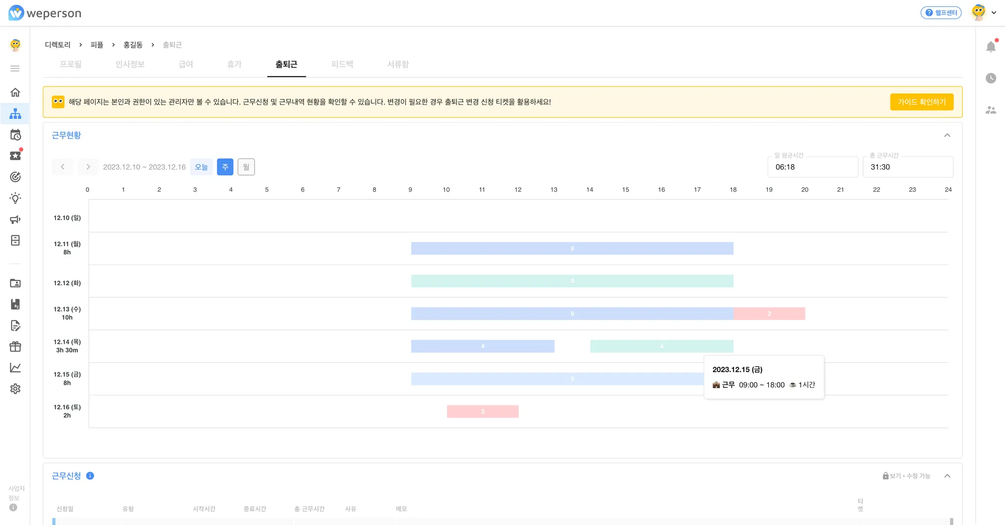 각 일자별로 근무 현황 및 휴가, 연장근무 내역을 확인할 수 있습니다.