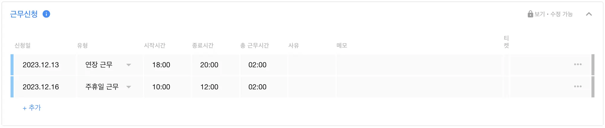 티켓을 통해 신청한 연장 / 주휴일 / 야간 근무 내역을 확인할 수 있습니다.