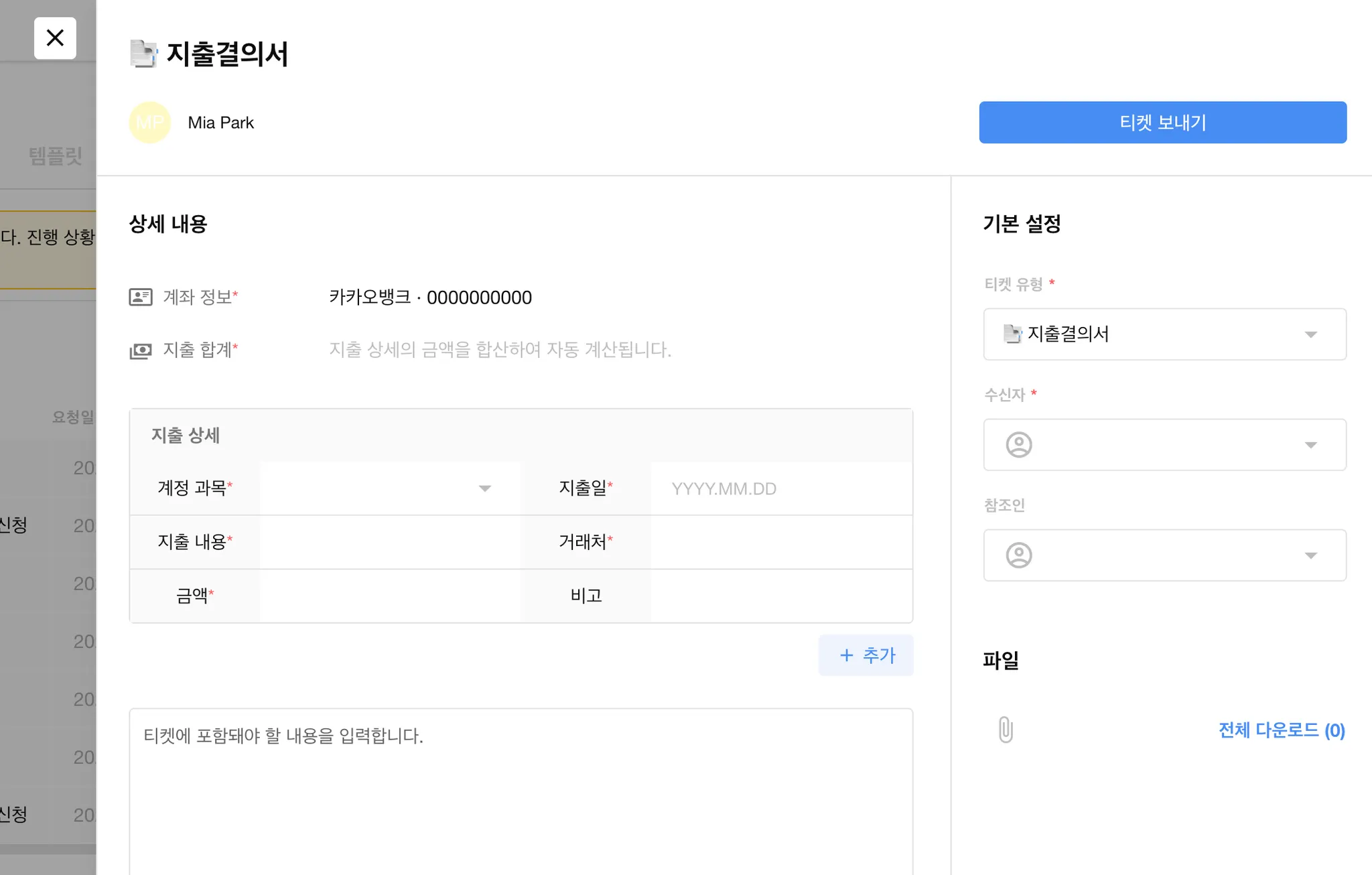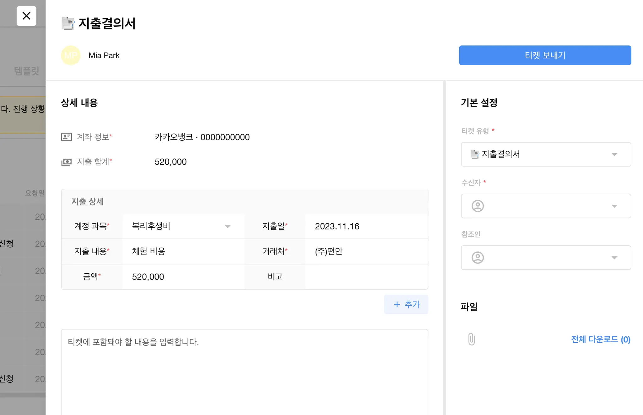 수신자와 지출 상세를 모두 입력하였다면 티켓 보내기 를 통하여 티켓을 발송하고, 수신자가 티켓을 확인할 수 있어요.