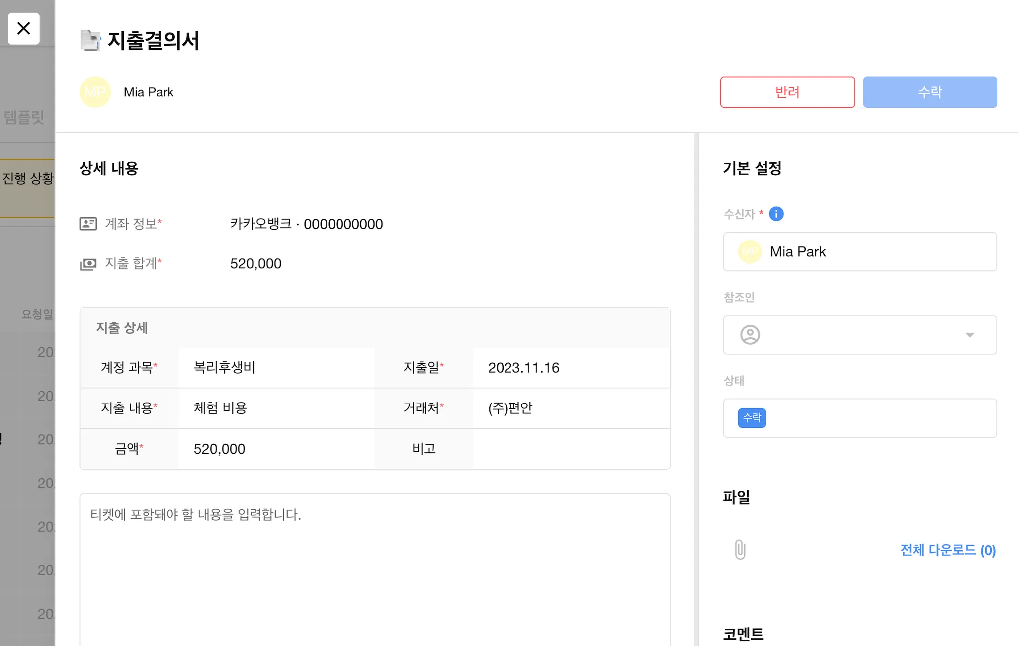 지출내역을 작성하고 관리자에게 지출결의서를 발송할 수 있습니다.